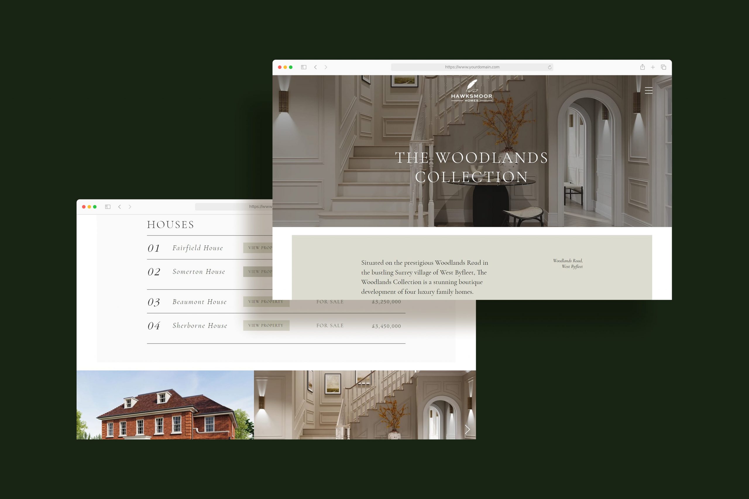 Full branding and marketing identity for The Woodlands Collection — four luxury family homes in West Byfleet, designed to reflect Hawksmoor Homes’ signature blend of elegance, craft, and contemporary living.